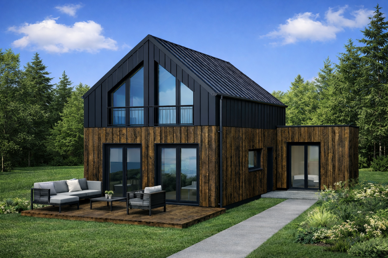 elewacja piętra oraz dach z blachy na rąbek stojący w kolorze antracytowym (RAL 7016)