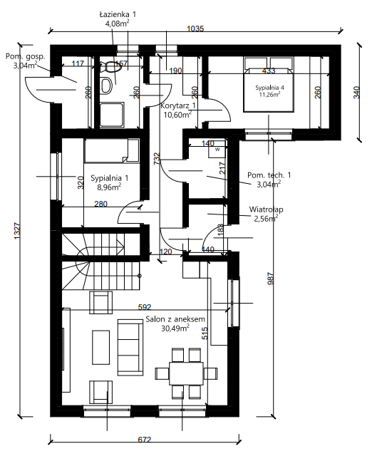 Układ pomieszczeń został zaprojektowany z myślą o dużej rodzinie oraz osobach pracujących zdalnie. Na parterze znajduje się przestronny salon z aneksem kuchennym, tworzący centralną, dzienną strefę domu, a także łazienka, wiatrołap, pomieszczenia techniczne oraz dodatkowe pomieszczenie gospodarcze z niezależnym wejściem z zewnątrz – idealne na przechowywanie mebli ogrodowych, sprzętu sportowego czy narzędzi.