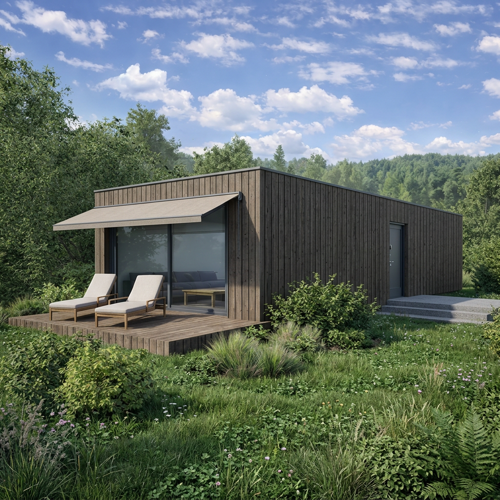 W-1 to kompaktowy, nowoczesny domek wypoczynkowy o zabudowie do 35 m², zaprojektowany z myślą o osobach, które chcą mieć własne miejsce do odpoczynku blisko natury. Prosta bryła z płaskim dachem oraz duże przeszklenia w strefie dziennej sprawiają, że wnętrze naturalnie łączy się z otoczeniem, a widok na zieleń staje się integralną częścią codziennego wypoczynku.