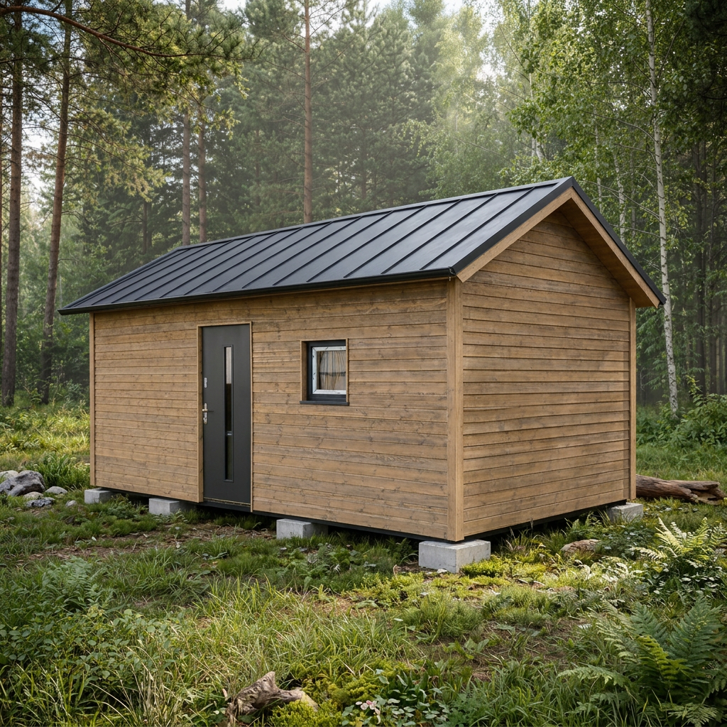 W-S2 to kompaktowy domek letniskowy ze skośnym dachem – idealny na ROD, jako mała baza weekendowa, pracownia lub prywatna sauna w ogrodzie.